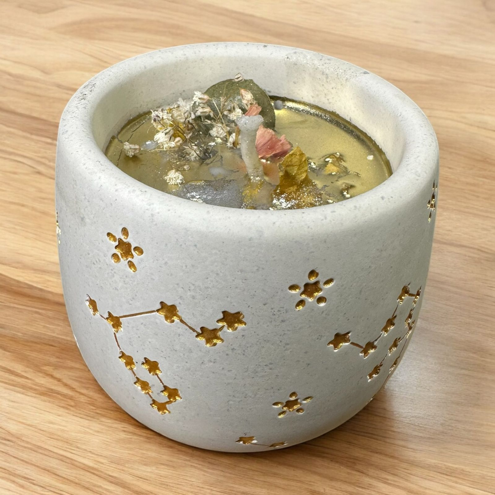La vela Constelación es un portal de luz y energía celestial. Su diseño en cerámica cruda con estrellas doradas evoca la inmensidad del cosmos, recordándonos que cada uno de nosotros es una estrella con un brillo único.